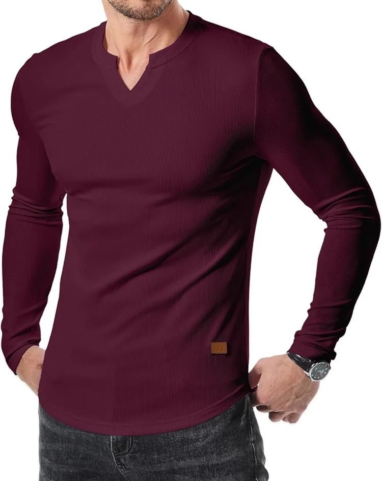 Men's Plain Casual Muscle Shirts for Men Slim Fitted T Shirt V-Neck Longline Ribbed Tees Shirts Long Sleeve Gym Workout Athletic Menswear Tops