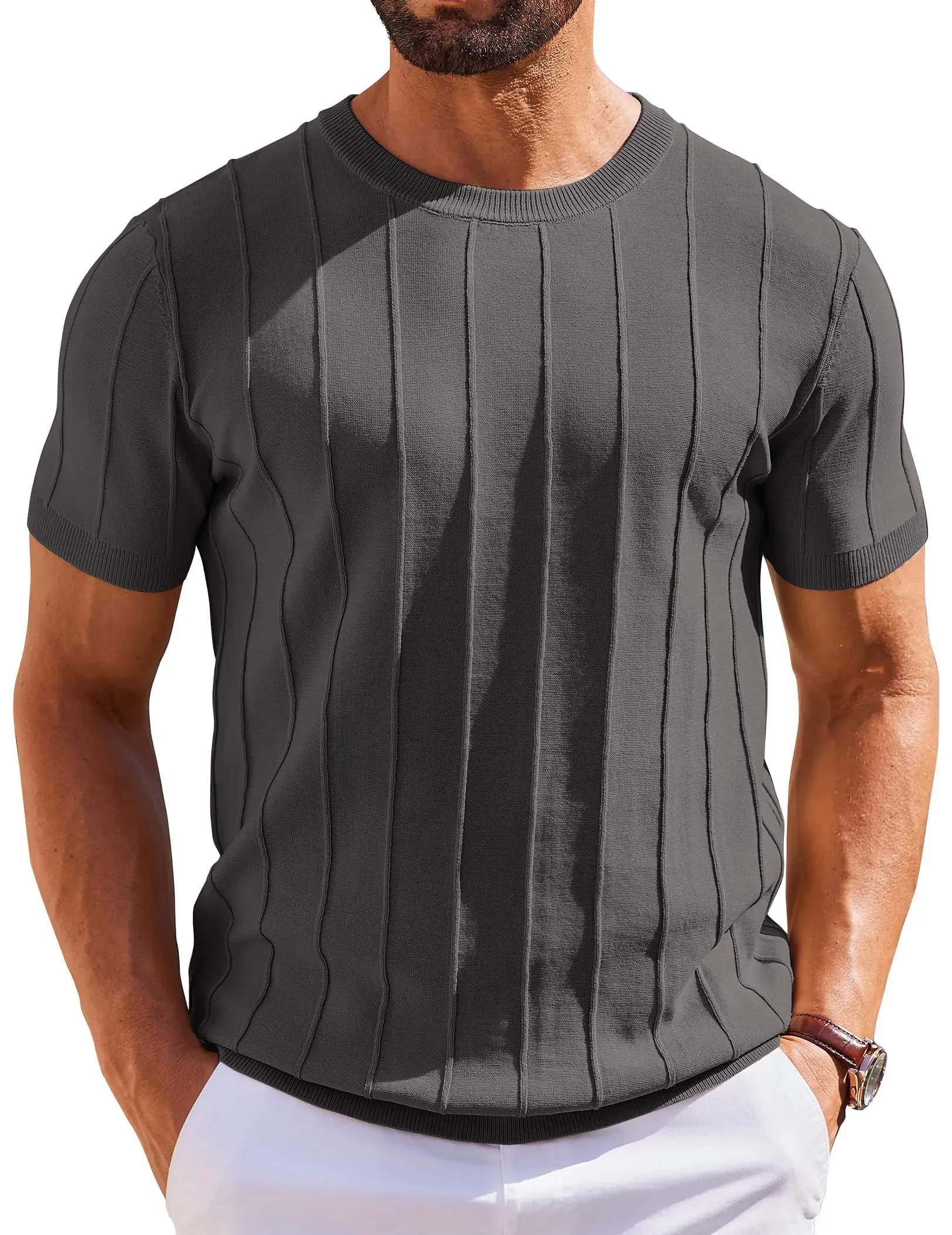 ·【Stylish Design】This mens tshirt blends a classic crew neck with unique ribbed texture and ribbed edges that flatter your shape. It adds a stylish and charming touch to any body type.