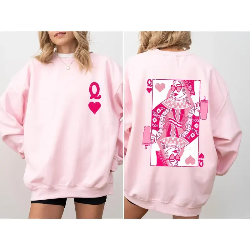 This Queen of Hearts, Cards, Games, Valentine's Day Sweatshirt pairs effortlessly with jeans for a chic, relaxed look or can be layered over shirts for added warmth and style. It’s ideal for both cozy nights in and lively gatherings with friends where games and laughter abound.