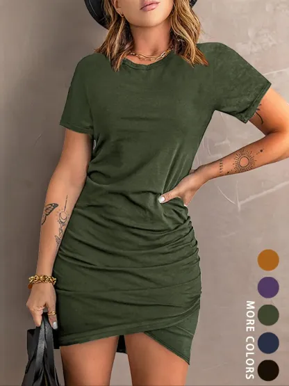 Women's Plain Ruched Wrap Dress, Casual Chic Short Sleeve Round Neck Short Bodycon Fit Dress for Summer