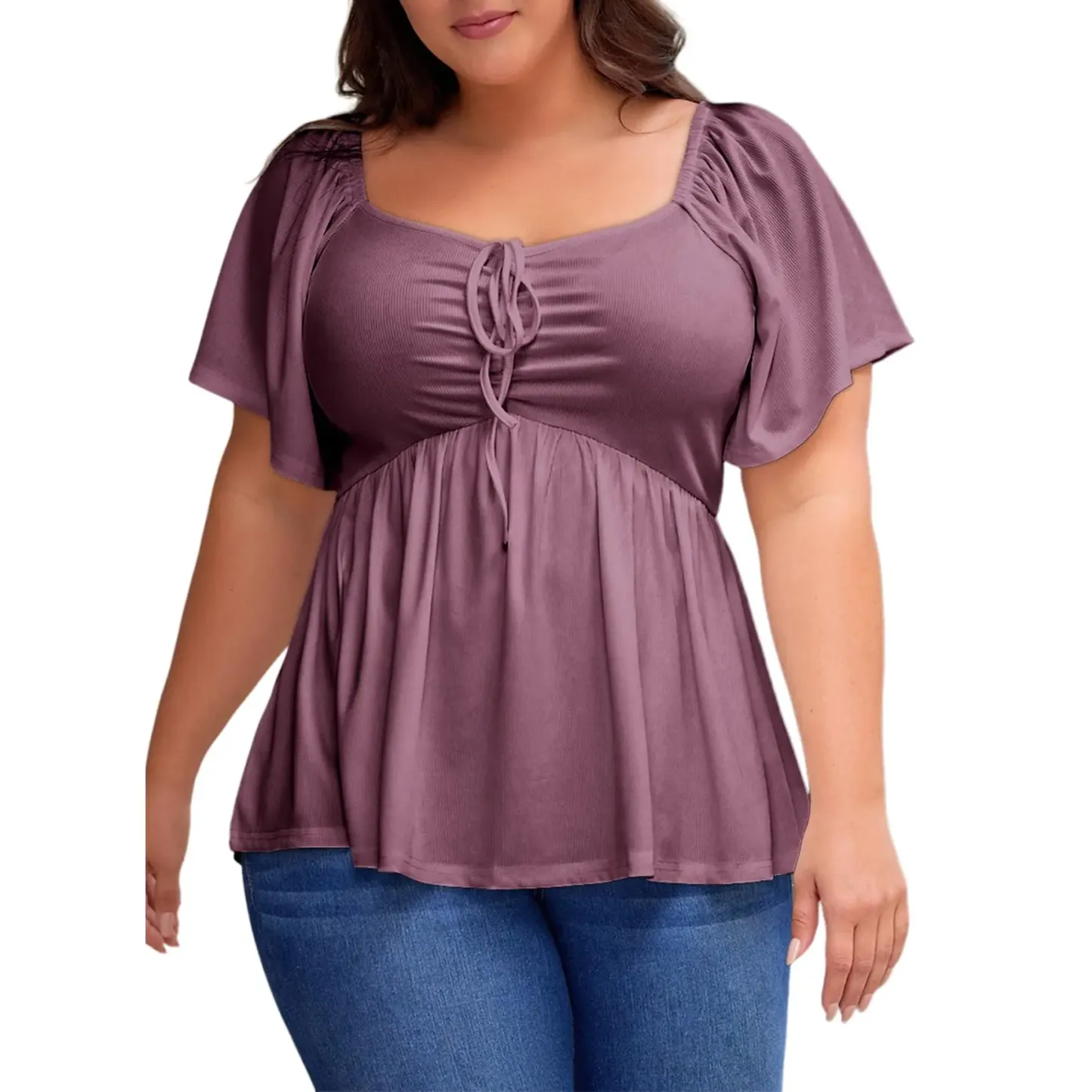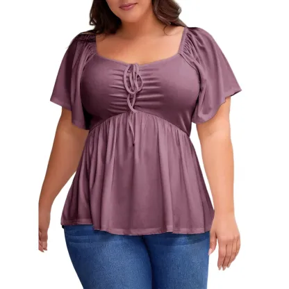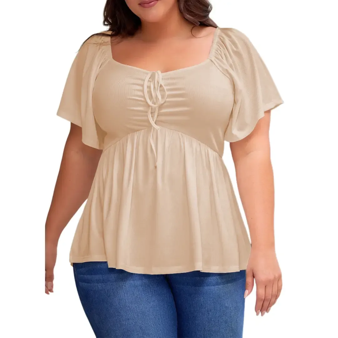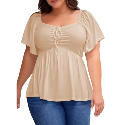 ·【Feature】Sweetheart neckline,short sleeve,square neck back,shirred ruched,plus size pullover peplum babydoll blouse shirt.